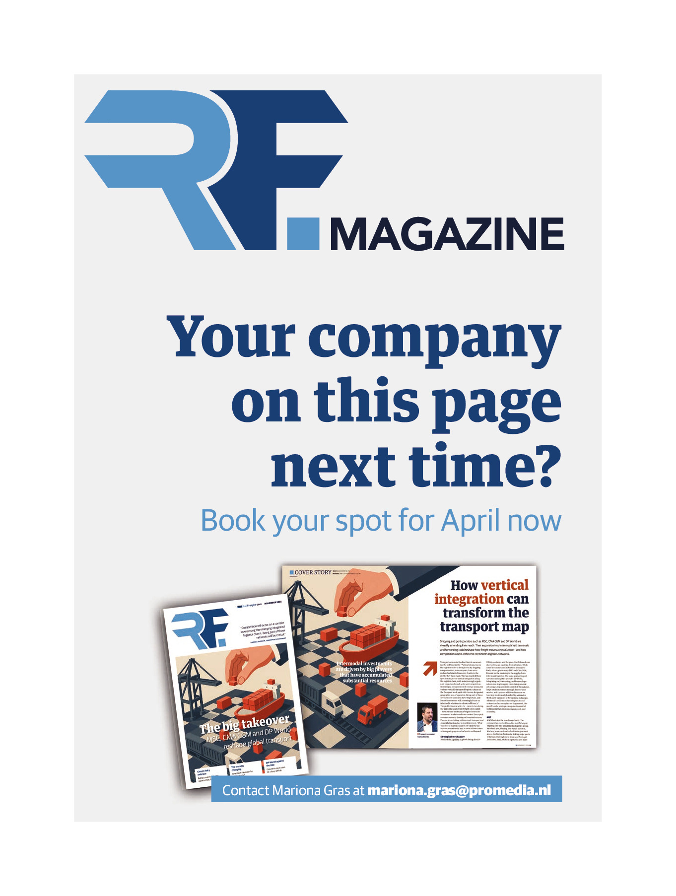 The second edition of the RF Magazine is already in the making. If you missed the opportunity to advertise in the first edition, this is your chance to join us! See our offer here or contact Mariona Gras (mariona.gras@promedia.nl) for further details.