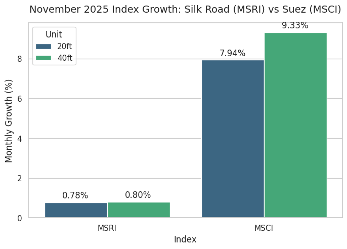 The Maxmodal Silk Road Index (MSRI) and the Maxmodal Suez Canal Index (MSCI) both increased in November 2025, with western Black Sea–Europe routes driving most of the overland gains while deep-sea repricing pushed up Suez-linked rates. The MSRI rose by 0.78% for 20-foot containers and 0.80% for 40-foot units, whereas the MSCI jumped by 7.94% and 9.33% respectively.