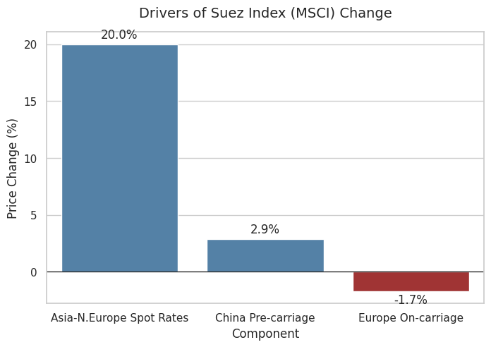 The MSCI increase was driven almost entirely by deep-sea freight. The deep-sea leg accounted for 98.8% of the monthly movement, while inland elements — China pre-carriage (+2.9%) and Europe on-carriage (–1.7%) — cancelled each other out.