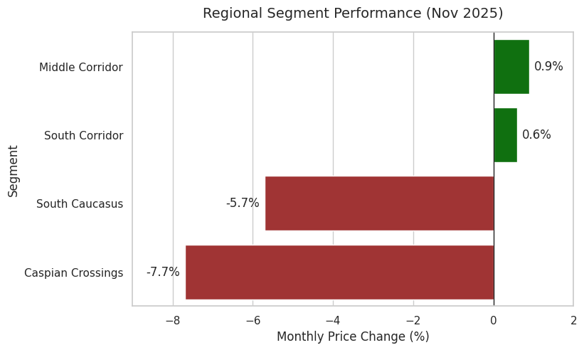 However, late-autumn conditions on the Caspian exerted downward pressure. Container volumes fell by 2–4% month-on-month as weather-related sailing cancellations slowed trans-Caspian flows. Forwarders responded with slight freight reductions of 0.5–1.1%.